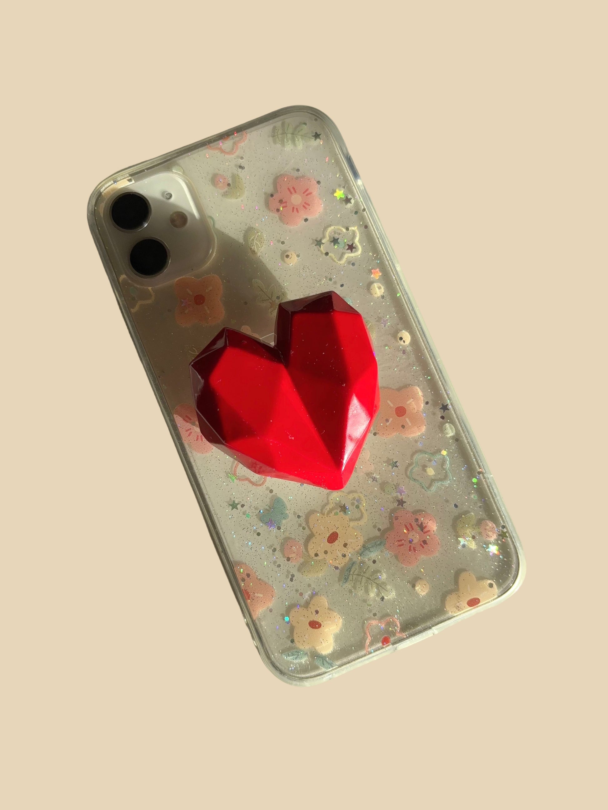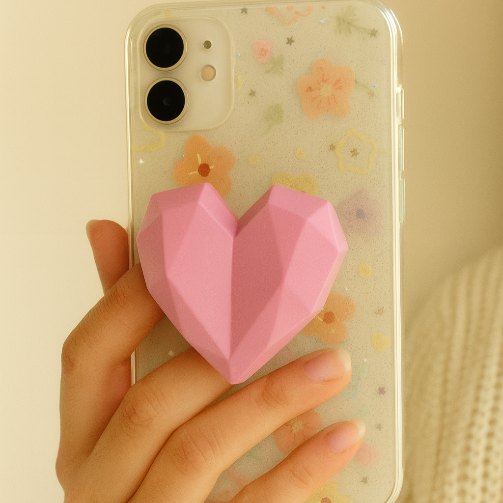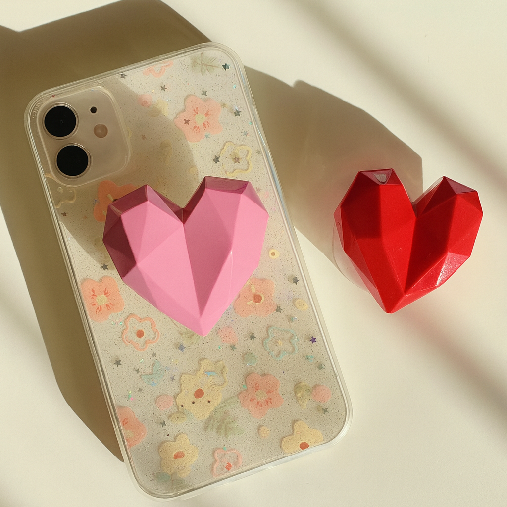 Add a bold touch of love to your phone with our geometric heart-shaped grip! Perfect for selfies, texting, or propping up your phone, this grip combines function with a super cute 3D heart design.